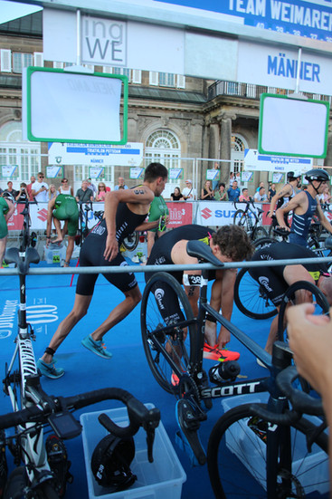 Da ich durch die Sonne wirklich keine Orientierung hatte, bin ich etwas erschrocken, als es plötzlich nach rechts um die Boje ging und somit schon die Hälfte geschafft war. Auf dem Rückweg versuchte ich dann weiter das Tempo hoch zu halten und sah auch kurz vor mir einen weiteren meiner Teamkollegen. Aus dem Hafenbecken heraus ging es eine Rampe und Stufen hinauf und hier fühlte ich mich auch ganz gut. Ich hatte mir vorher eine Markierung hinter meinem Wechselplatz ausgeguckt und als ich in den Wechselgarten rannte fixierte ich diese Markierung auch, rannte dann jedoch an meinem Rad vorbei, da ich einfach nur auf diese Markierung fixiert war. Vielleicht war ich auch etwas überrascht, dass ich für meine Verhältnisse so weit vorne aus dem Wasser gekommen bin und noch so viele Räder dastanden. Ich musste dann kurz zurück und verlor dabei mindestens 5 Sekunden. Zu Beginn des Radfahrens war es etwas kurvig und da hing ich direkt hinter einem langsamen Athleten fest und kam da erst nach ein paar Sekunden vorbei.