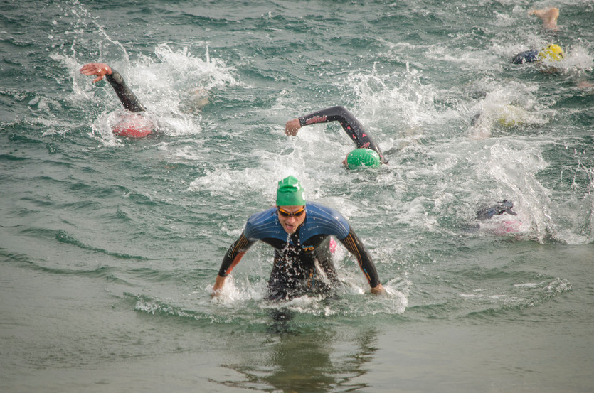 Die Aufregung vor dem Start hielt sich bei mir in Grenzen und ich freute mich, dass aufgrund des 16 Grad kalten Wassers auch das Schwimmen mit dem Neo möglich war. Ein Großteil unserer Taktik ging auch auf, sodass Alex & Richard gemeinsam sehr weit vorne auf die Laufstrecke starteten. Richard erwischte hier leider nicht seinen besten Tag und konnte das Tempo von Alex nicht mitgehen und uns war schon bei der Hälfte der Laufstrecke klar, dass Aaron & ich direkt mit Alex abschlagen würden und es dann auf uns beide ankommen wird. Wir gingen als 8. Team ins Wasser und hatten direkt ein Team vor uns. Das Schwimmen fühlte sich bei mir wirklich gut an und so setzte ich mich auf der zweiten Hälfte der Schwimmstrecke an die Spitze der kleinen Gruppe, um dann beim Wechsel nicht so viel Stress zu haben.