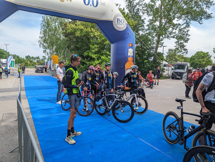 Der Wechsel mit Neo ausziehen und Helm auf klappte reibungslos, jedoch merkte ich gleich, dass der Gummi am linken Schuh gerissen war und somit beide Schuhe nicht wirklich günstig fürs Aufspringen standen. Irgendwie habe ich dann meine Füße auf die Schuhe bekommen und es ging erstmal mit Vollgas los, um auch in dem kleinen Grüppchen kurz vor uns Anschluss halten zu können. Das Ganze hat für Aaron auch super geklappt und so befanden wir uns in der Mitte des Feldes in einer Radgruppe die auch (dank Lasse Lührs) sehr zügig unterwegs war. Auf der Radstrecke passierte dann nicht mehr wirklich viel, jedoch konnte der Abstand nach hinten etwas vergrößert werden.
